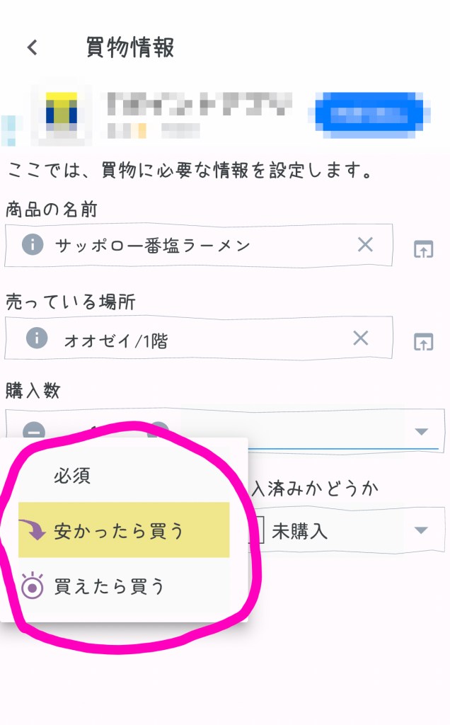 【お使いブギー】では買い物リストのアイテムに購入レベルをつけられるので「安かったら買ってね。高かったら無理して買わなくていいよ。」の場合は「安かったら買う」するとお使いする人にもわかりやすく、節約にもなります。