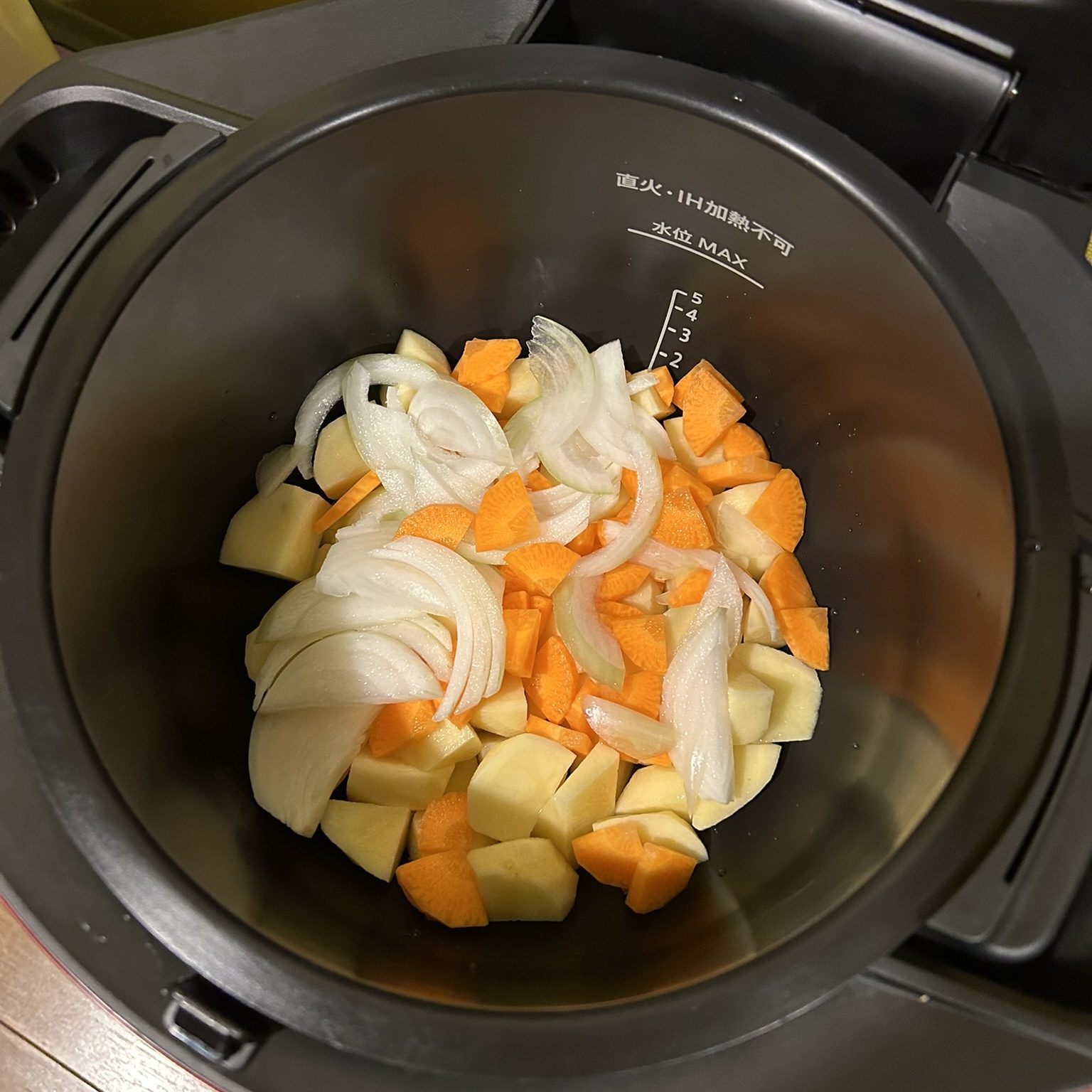 ホットクックを使ってゆでるものは、じゃがいも、にんじん、玉ねぎでそれらを切って鍋に入れます。じゃがいもは2センチの角切り、にんじんはいちょう切り、玉ねぎは薄切りで。