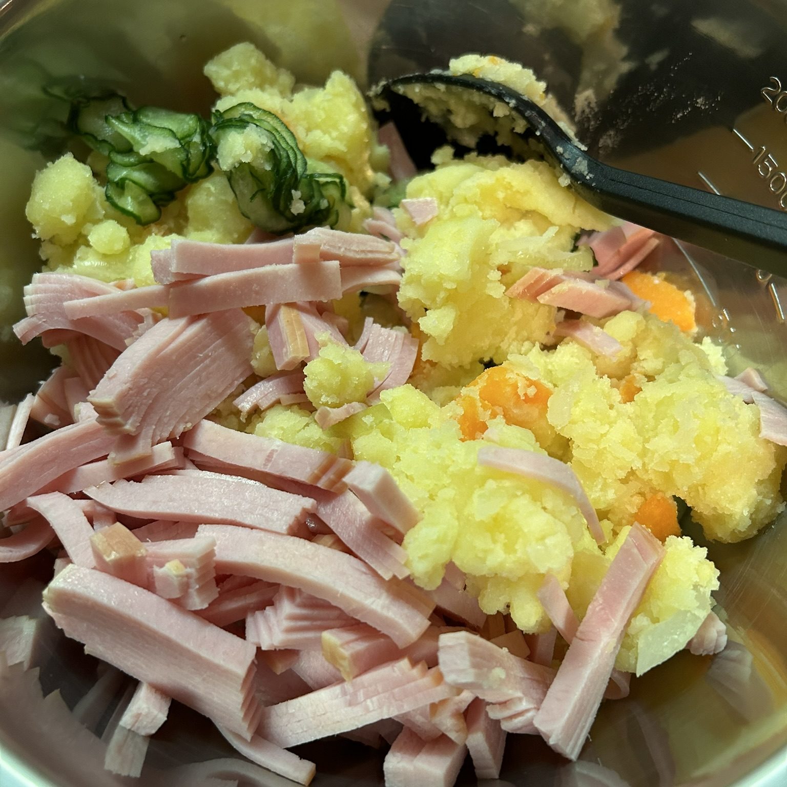 切って塩で水分を出して絞っておいたきゅうり、ハムの切ったもの、ゆで卵の切ったものを加えます。