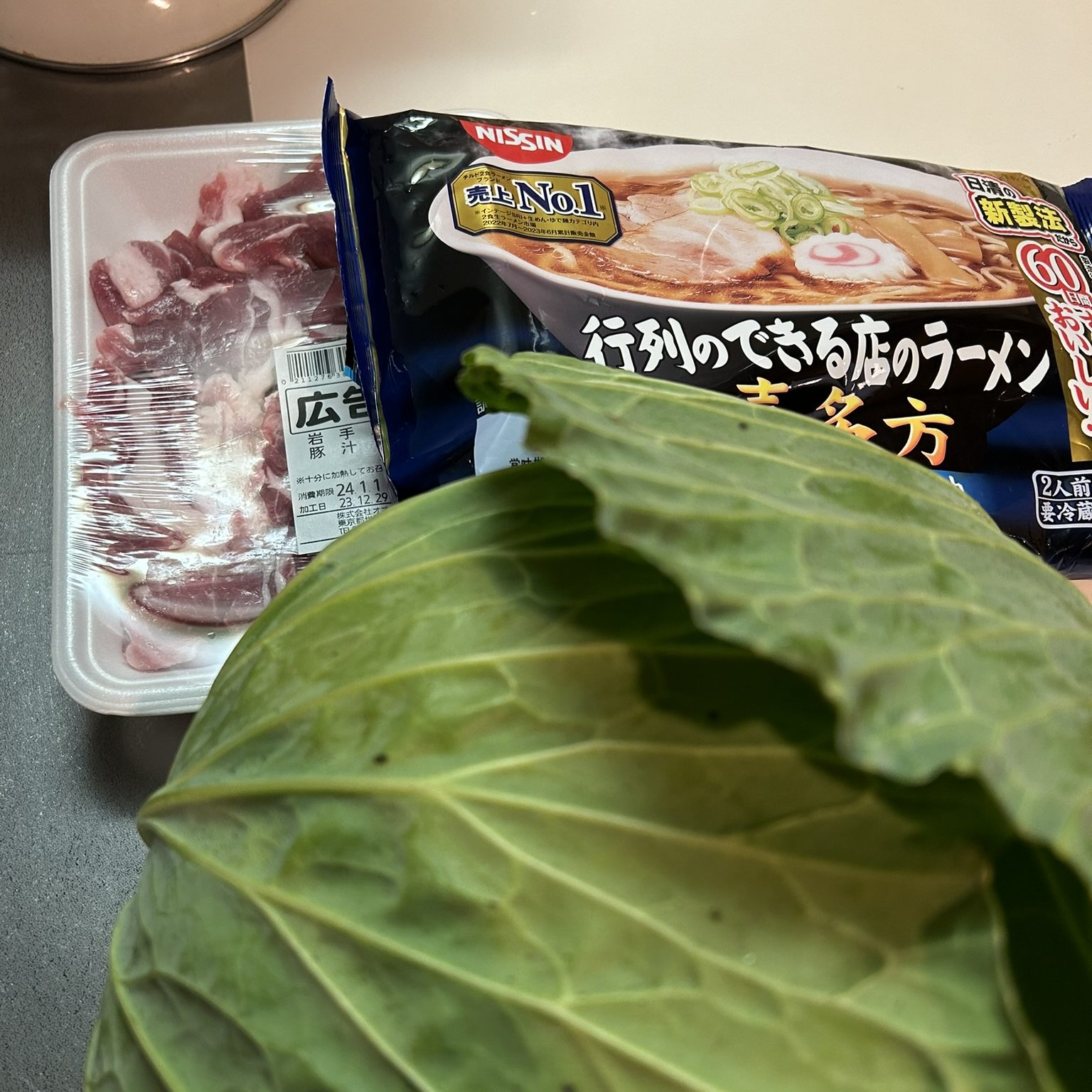 まずは材料ですが、生協の生産者応援グリーンサポートでキャベツがまるっと1個来たのでこれを使うことにしました。それと豚肉、ラーメンは喜多方ラーメン、後は冷凍してあったネギも入れました。