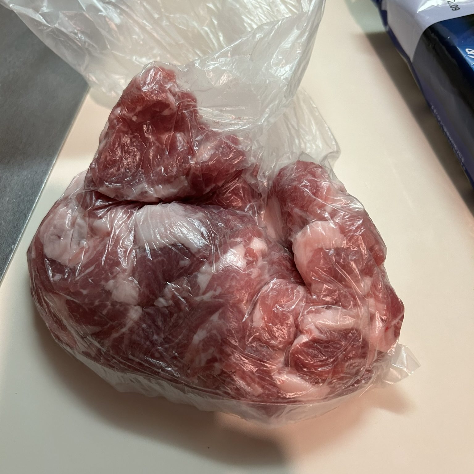 豚肉は予め片栗粉をまぶしておきます。ビニール袋に入れて揉みこんでおくと、片栗粉もなじみやすいし使う時も便利です。片栗粉をまぶすと仕上がりが柔らかくなると、テレビで料理研究家のリュウジさんがおススメしていて、テレビで見て以来ずっとやっています。