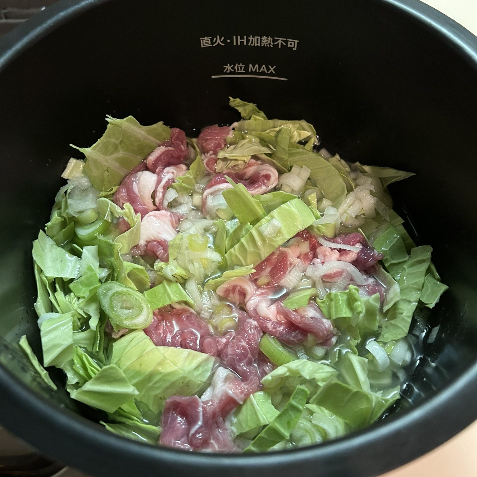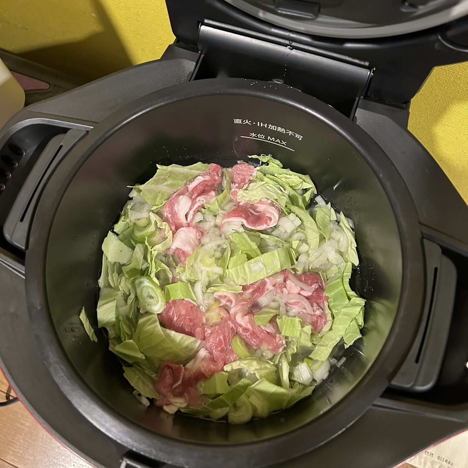 まずは、キャベツを切って、豚肉、水(900ml)を内鍋に入れ、内鍋をホットクック本体にセットします。