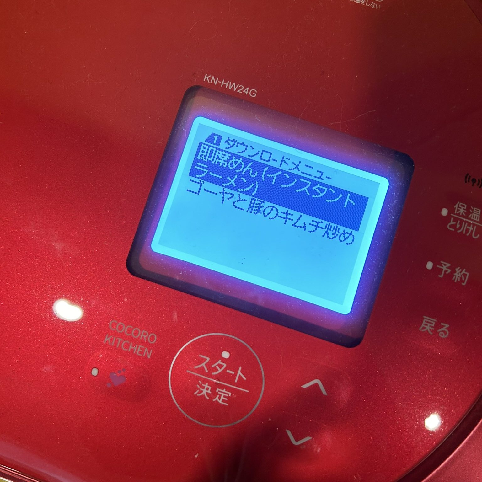 ホットクックのダウンロードメニューの「インスタントラーメン」を選択します。このメニューは最初から、メニューツリーにはないので、メニュー番号94を選択します。選択すると「ダウンロードするしない」を聞いてきますが、リピする場合は、ダウンロードしておくと便利です。