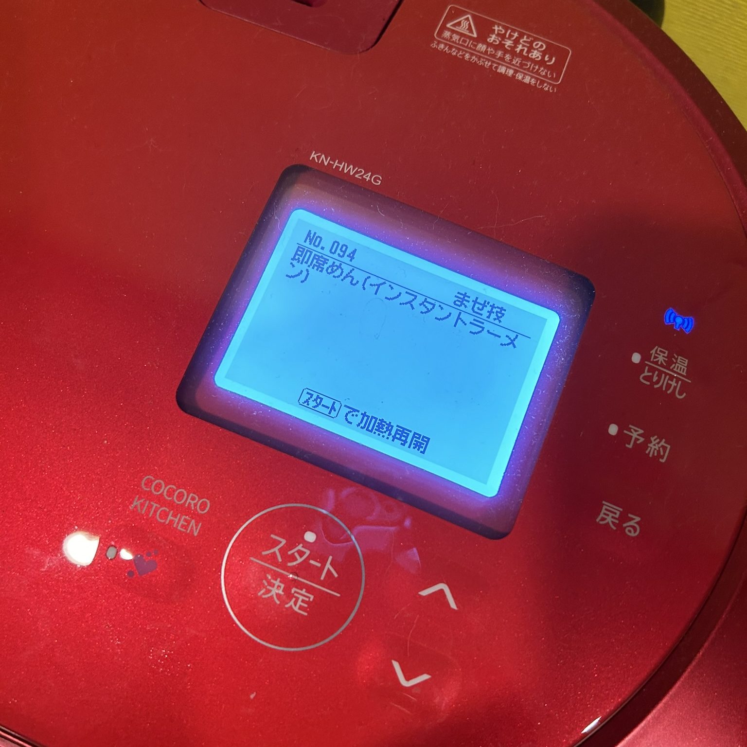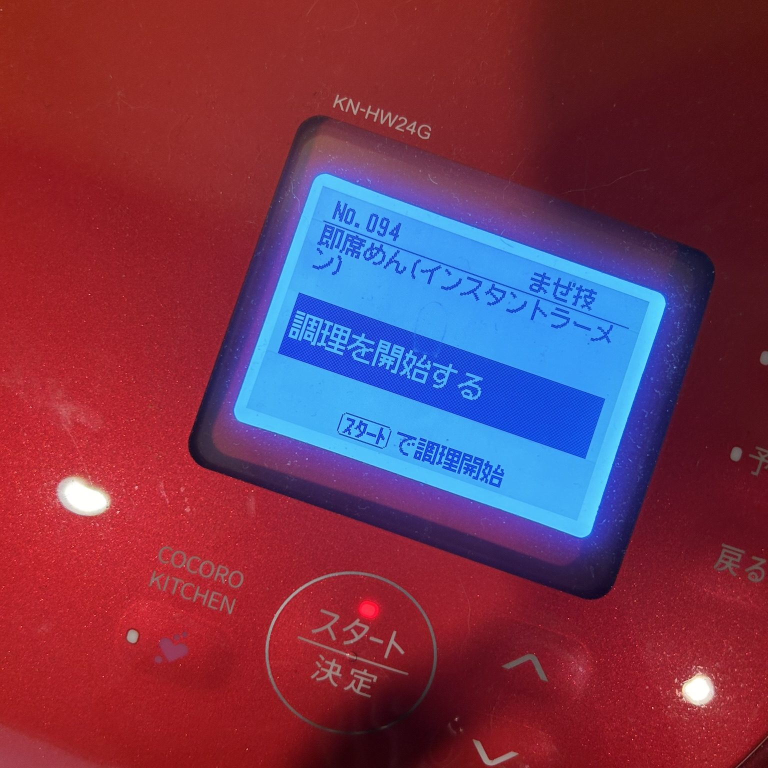 このメニューは、最初に麺とスープの素以外の材料を入れて煮込み、報知音が鳴ったら麺を入れ、出来上がったらスープを入れて作るものです。インスタントラーメン用ですが、生ラーメンにも応用できます。