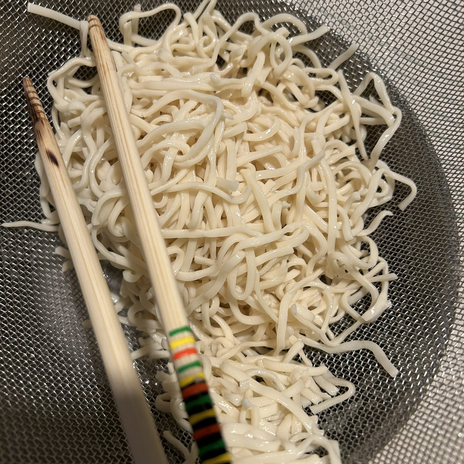 1つ目は、別湯での麺を無理に後入れで何とかしようとしたことにあります。粉のついている麺をそのままホットクックに入れるとスープが粉っぽくなってしまうと考えて、水洗いをしてみたのですが、粉はちゃんと落とすことができました。そして、スープも粉っぽくはならずに済みました。しかし、洗っているときにちぎれたのか、麺を入れる前に麺が結構短くなってることに気づきました。