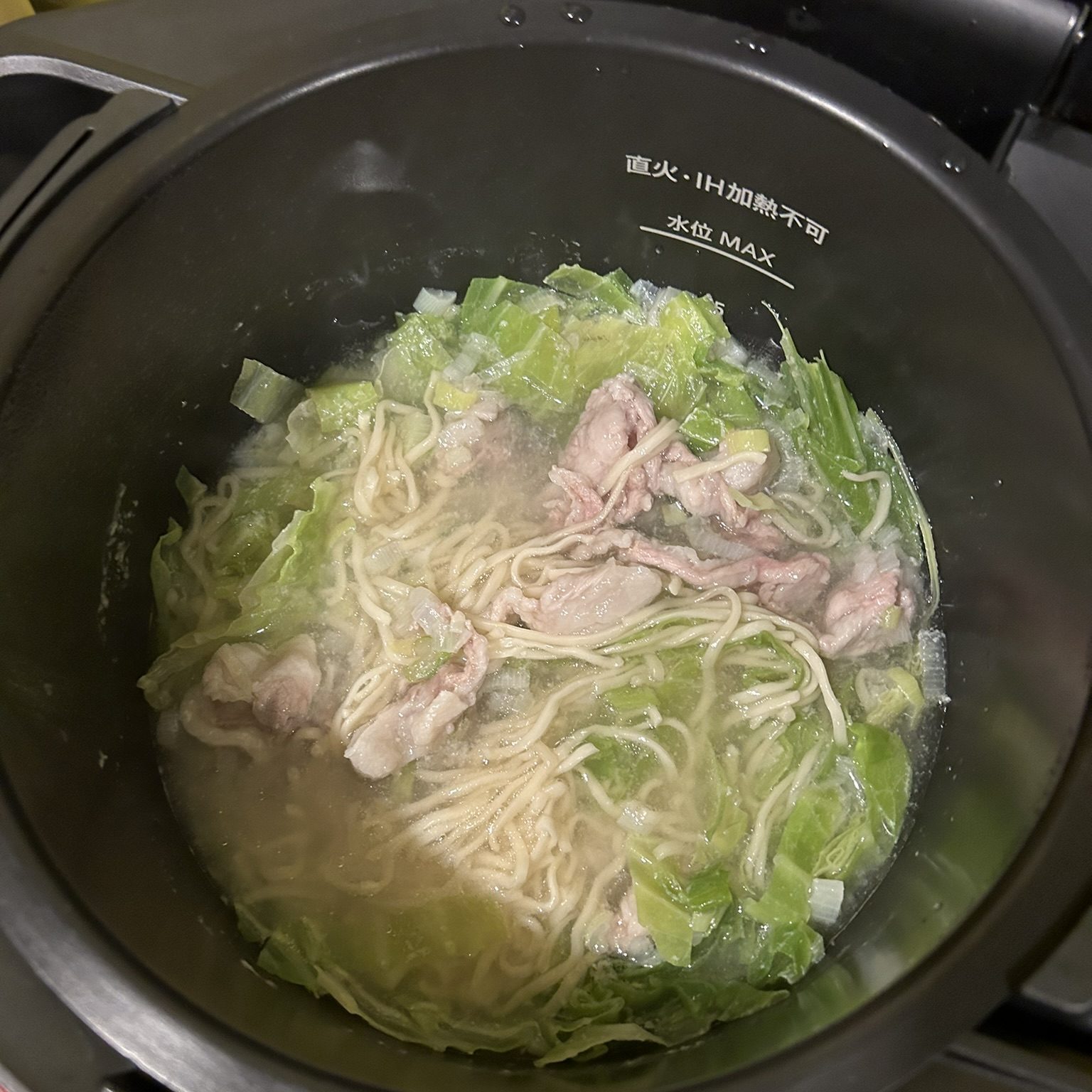 調理の途中で報知音が鳴ります。ここで麺を入れます。蓋を開けるとこんな感じでキャベツと豚肉がよく煮えています。