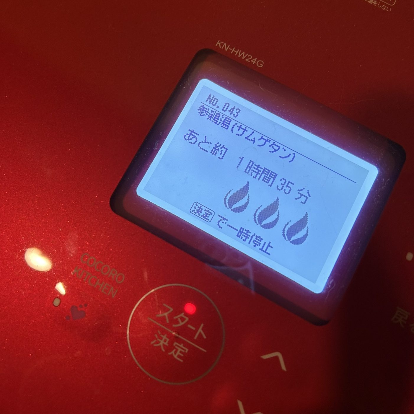 さて、ホットクックの煮込み時間ですが、漢方薬のタカキ大林店さんのレシピは、ホットクック用ではなく、沸騰後20分煮るとありました。でも、せっかくホットクックでやるんだし手羽先もよーく煮えていたらいいかなあと思い「参鶏湯」のメニューを選択しました。