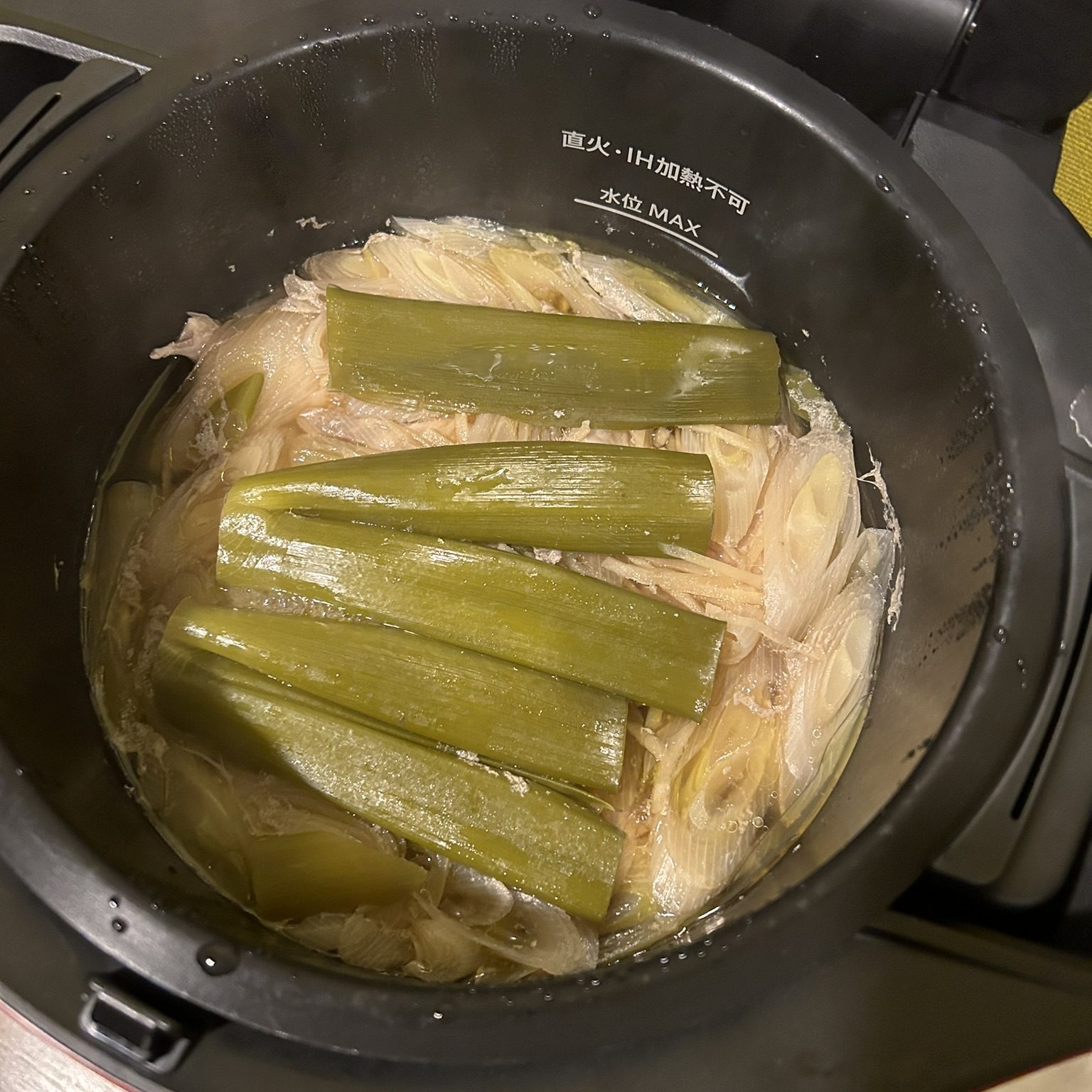元のレシピには、ネギは2本となっていてネギの比率がこれよりも多かったです。しかし、今回は他のものに使う予定があったので1本分としました。また、捨ててしまうネギの青いところは2本分入れることにしました。