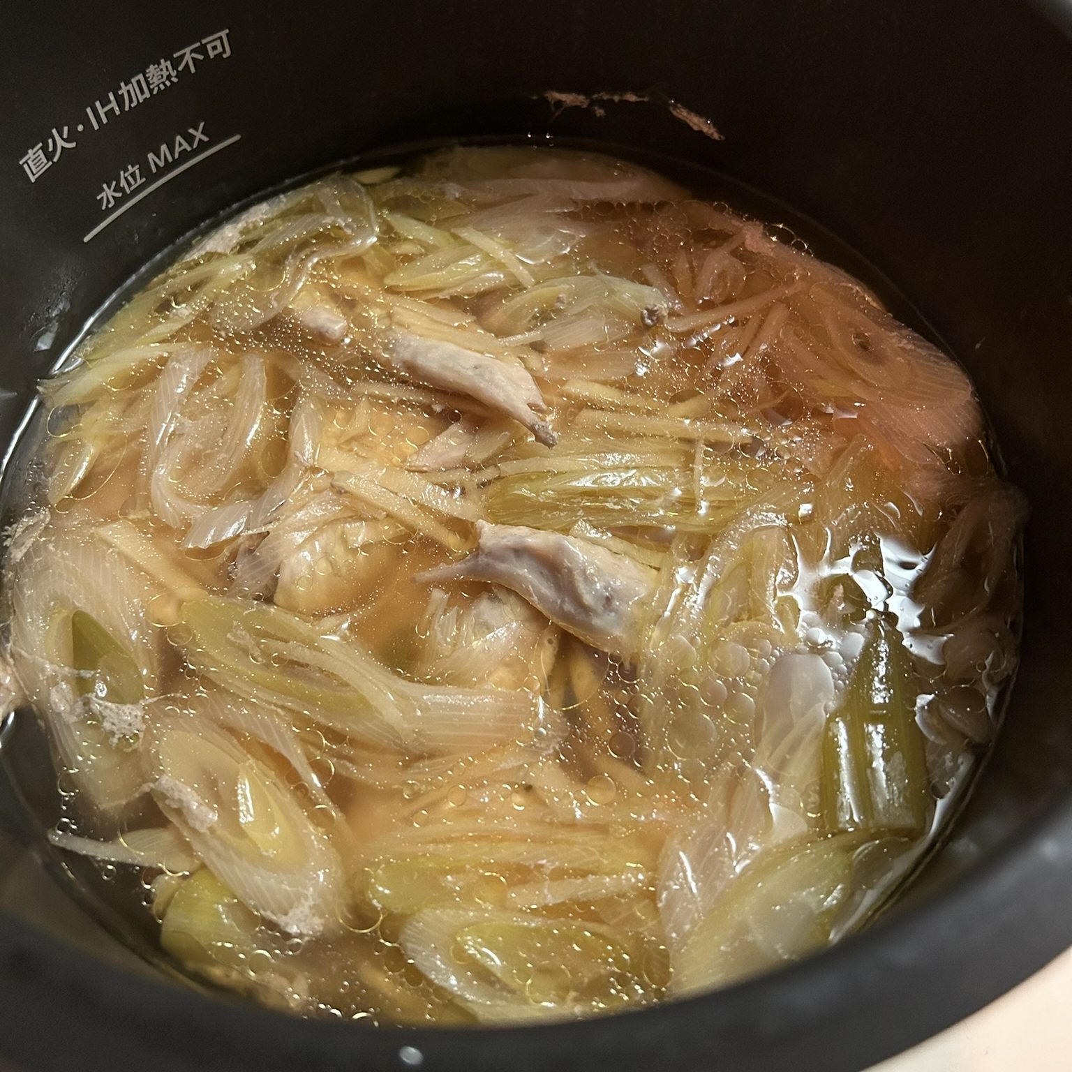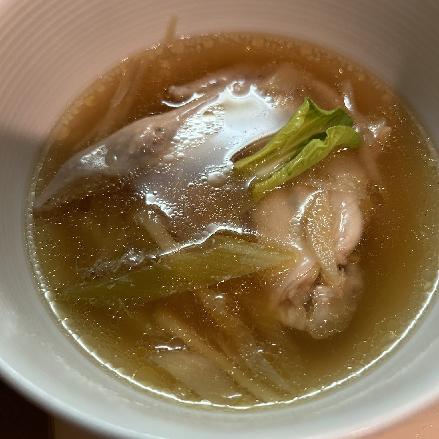 スープが出来あがりました。手羽先は軟骨も柔らかくなっています。水が多くてネギが少ないかなと思ったのですが、そうでもなくショウガとネギが具材としてしっかり入ったスープになりました。