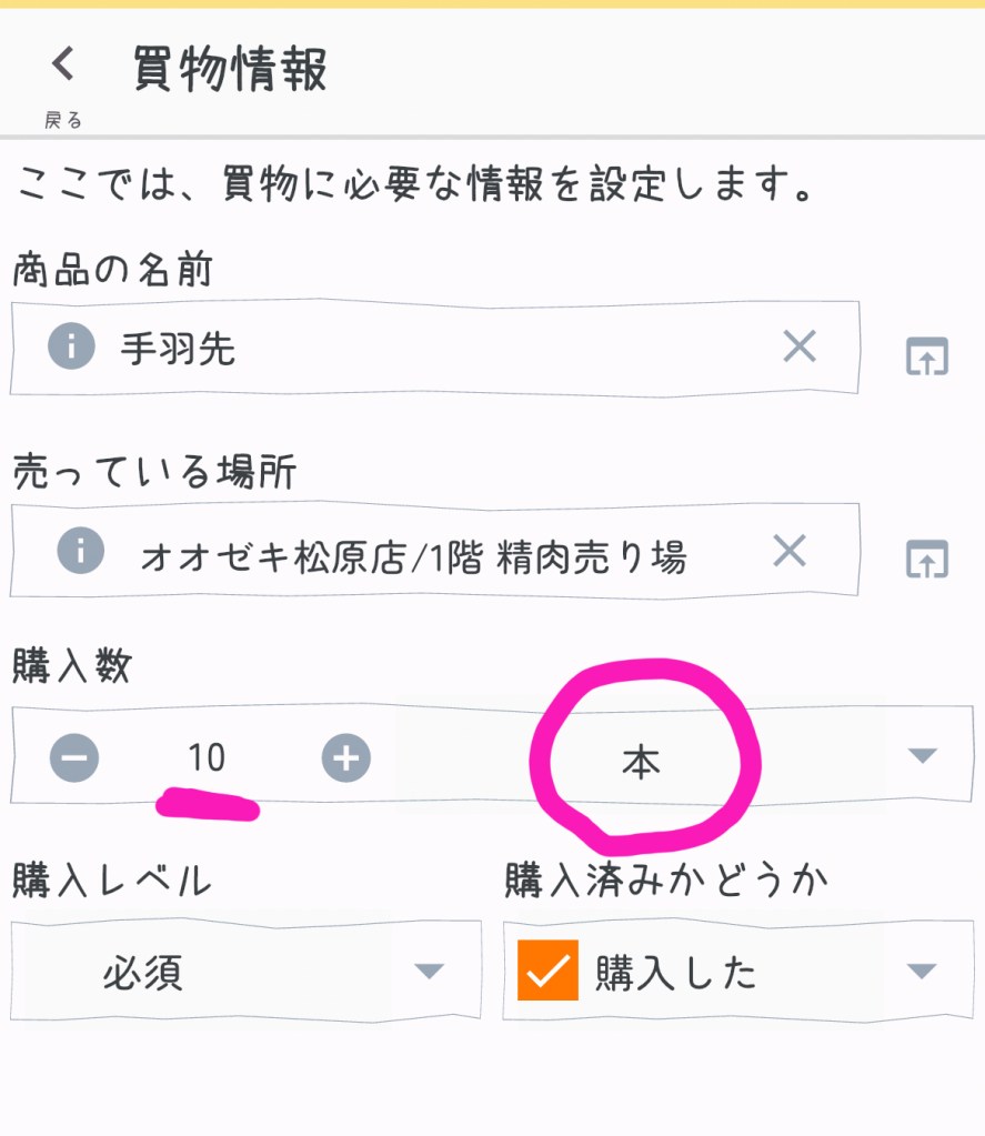 【お使いブギー】では数量を指定しさらにその単位も入れらます。