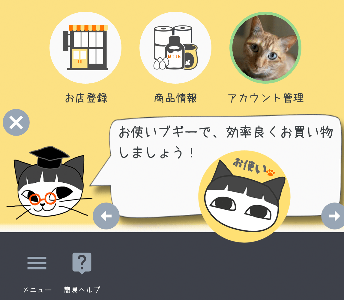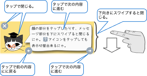 簡易ヘルプの表示が不要になったら「閉じる✕アイコン」又は、猫の顔部分をタップすると閉じます。簡易ヘルプ自体を下向きにスワイプしても閉じます。