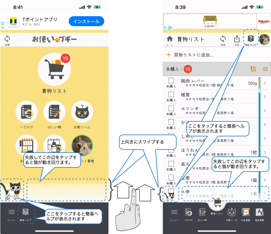 買物リストやその他の画面では、画面上部ののヘッダー部分にある「簡易ヘルプ