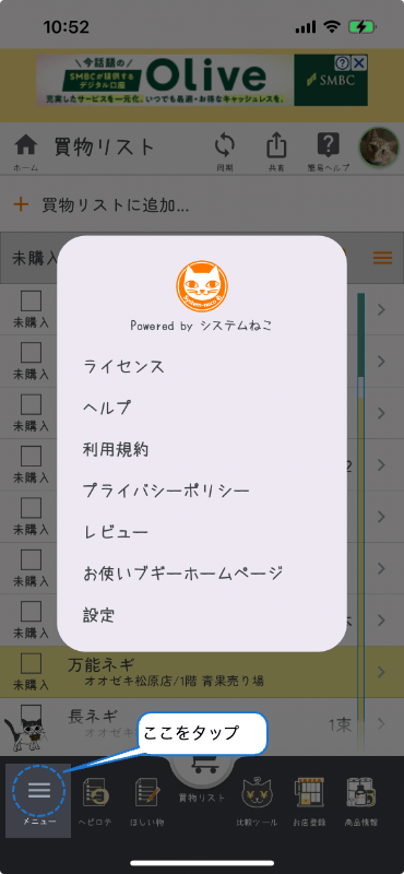 アプリを作成する上で、オープンソースのライブラリを多数利用しています。買い物には全く関係ありませんが、オープンソースライブラリの利用条件としてライセンスの表示は必須となります。