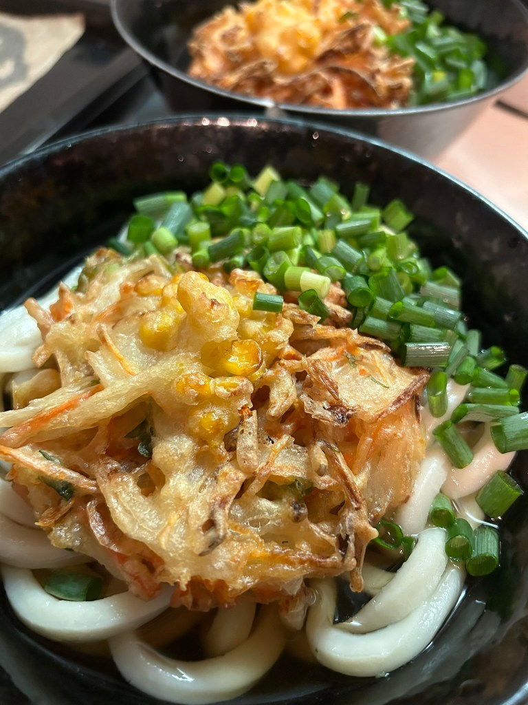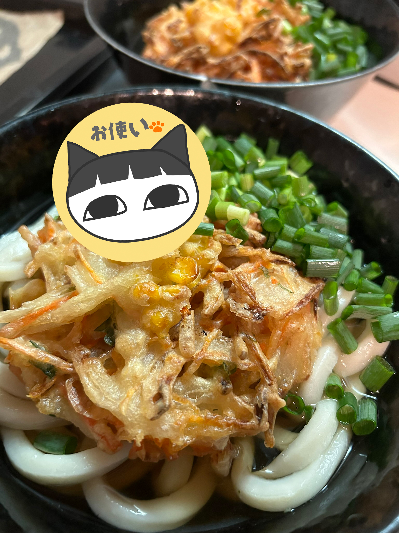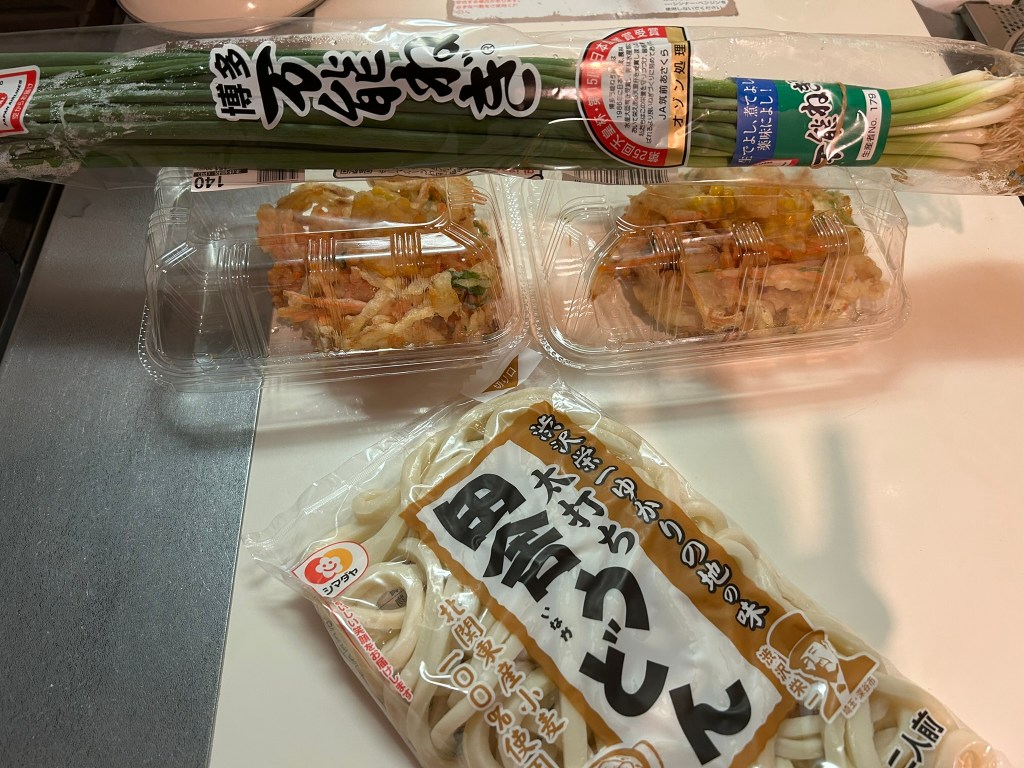 スーパーでかき揚げとうどん、青ネギを買いました。