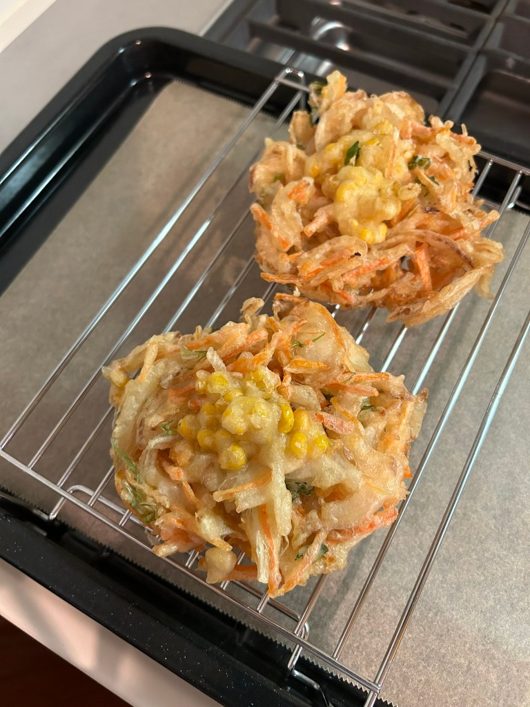 1段目にはサックリあたためたいものを入れます。今回は、スーパーで買った普通のかき揚げ。コーン入りです。油が下に落ちるのでクッキングペーパーを下に敷いておきます。
