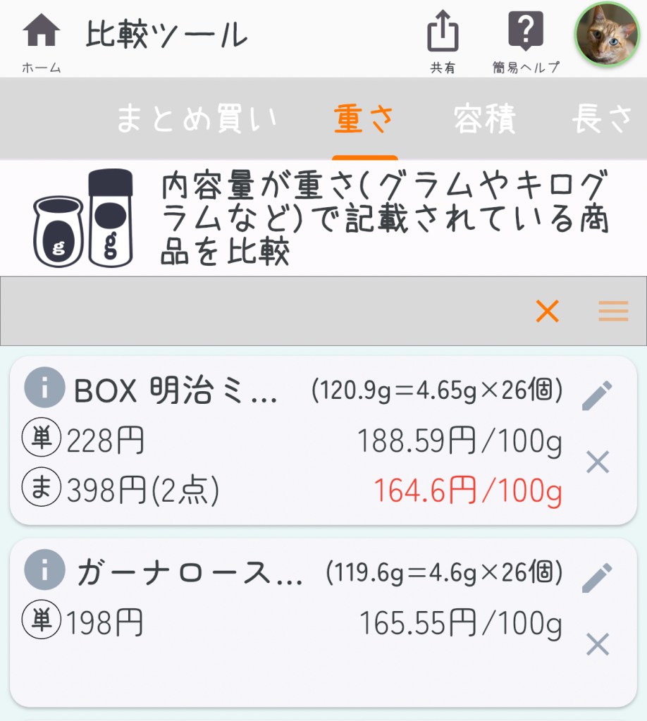 どっちを買いますか?安い方で言えばロッテですね。しかし、100g当たりの単価はどっちがお得でしょうか?明治のチョコは、1枚当たり4.65gです。ロッテは1枚当たり4.6gです。枚数は26枚で同じです。