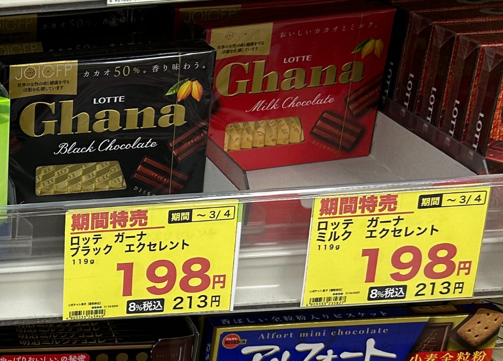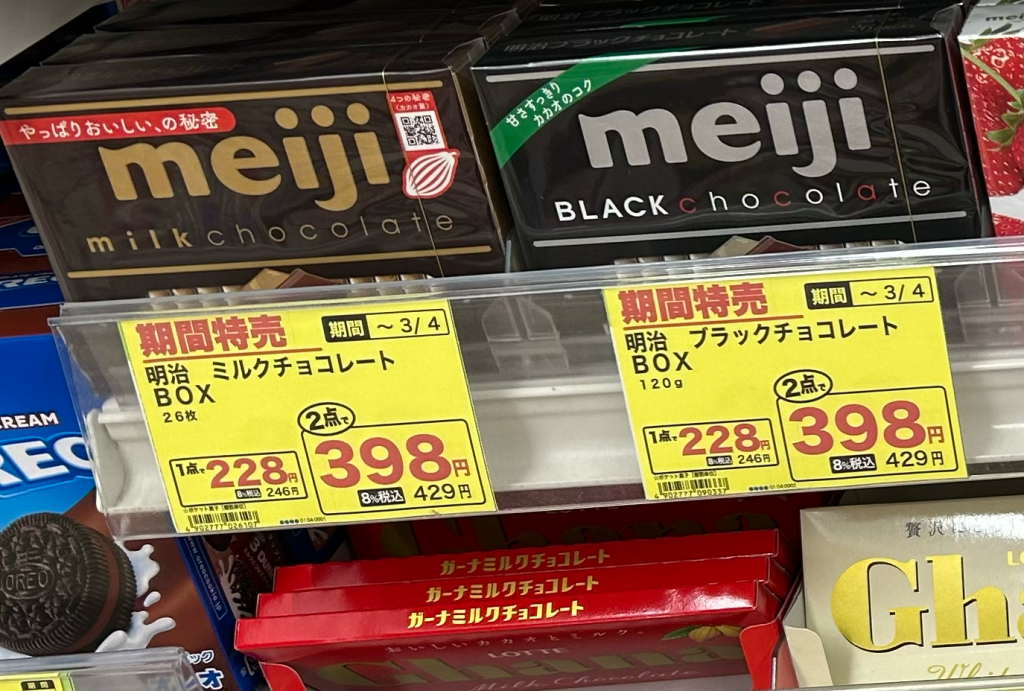 2点まとめ買いなら1点あたり199円です。しかし、その隣には、ロッテのチョコが1点198円で売っていました!なんと1円安いです。