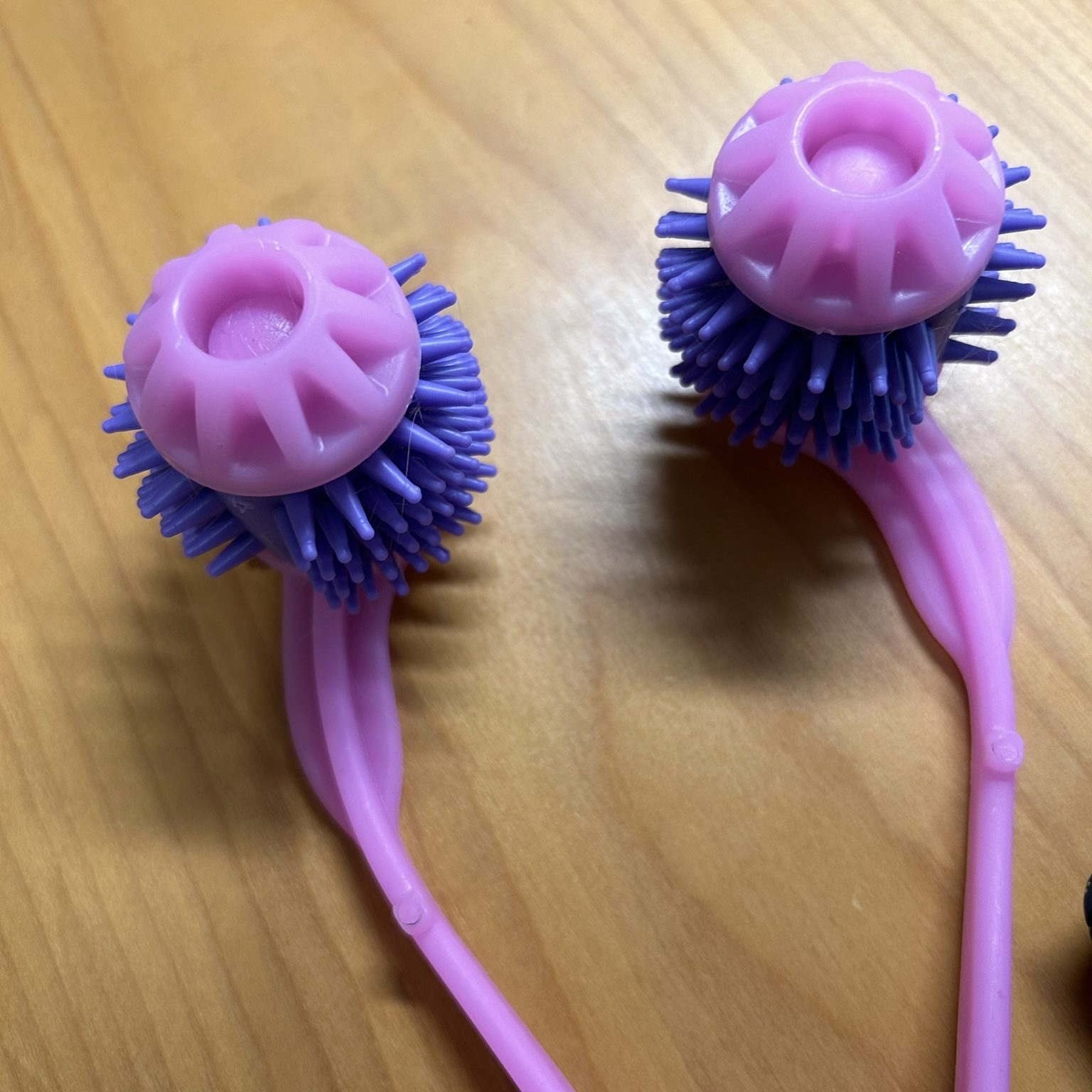 この美顔マッサージ器ですが、アタマの部分の紫のところはシリコンで出来ていて柔らかいのですが、ピンクの部分は柄と同じプラスチックでできています。背中をやるときなどピンクの部分も当たりますが、固いのでトラきちはあまり好きじゃないかも。