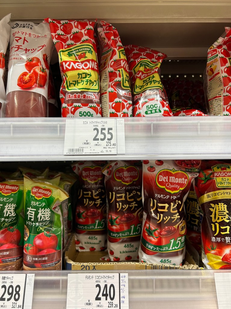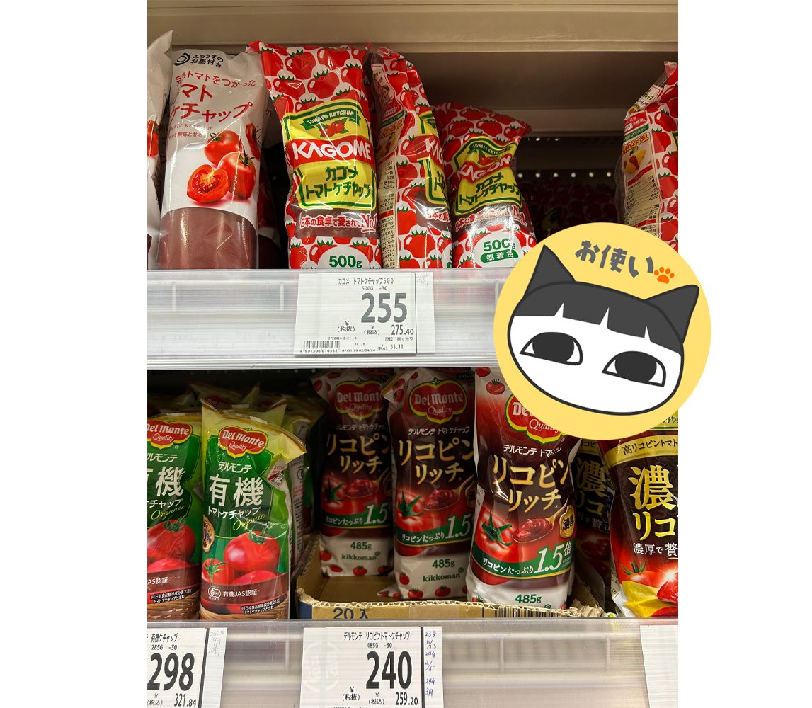 さて、「カゴメトマトケチャップ 500gで255円」と「デルモンテ リコピンリッチ485gで240円」どちらにしようかな?