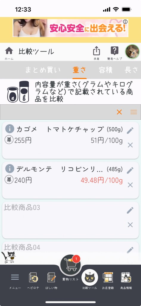 今回は、カゴメよりも、デルモンテのリコピンリッチの方がお得そうなので、リコピンリッチを買うことにしました。重さや価格をいちいち入力するのは面倒ですが、一度入力しておけば次に値段が変わったときに修正は楽になります。