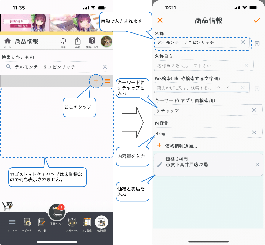 新規に登録する際、検索文字列(ここでは「カゴメ トマトケチャップ」)が自動で名称にセットされます。