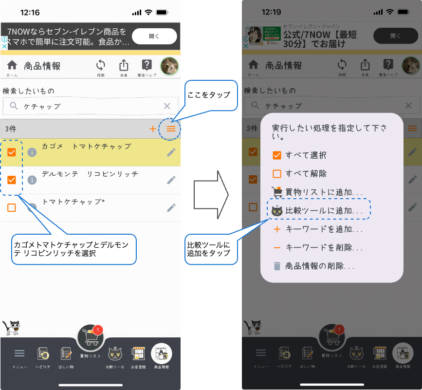 検索結果で「カゴメトマトケチャップ」、「デルモンテリコピンリッチ」をタップして選択常状態にします。検索結果の右上にあるメニュー