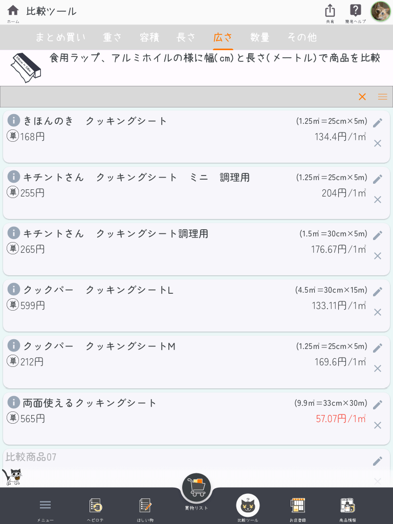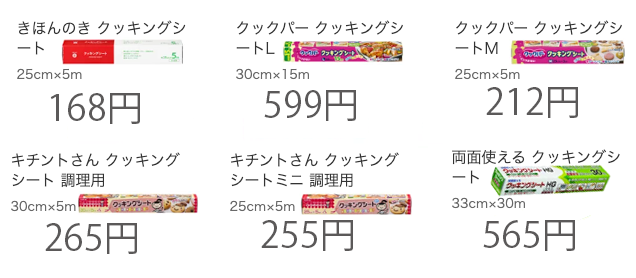 「幅×長さ」の比較だと他には、食用ラップやアルミホイルなどがありますね。食用ラップだと結構、機能差がありそうなので単に「安いから」と言うだけでは比較出来ないかな?と思います。