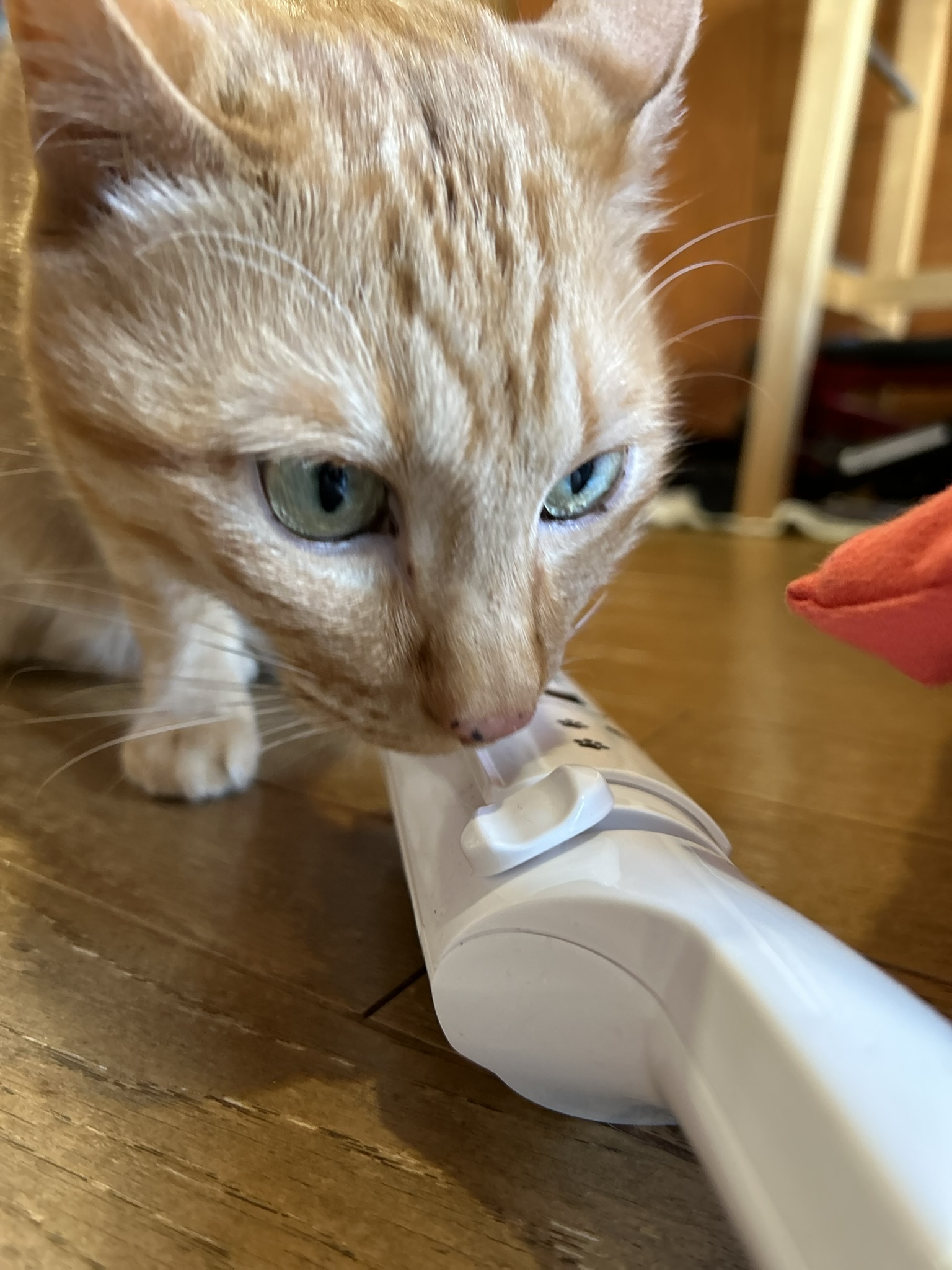 ところでこのワイパーをかけ始めると、トラきちは落ち着かないのか寝てても起きてしまいます。うるさいからどこかに行くのかと思いきや、このブラシが動いているのに注目して遊ぼうとするようになりました。