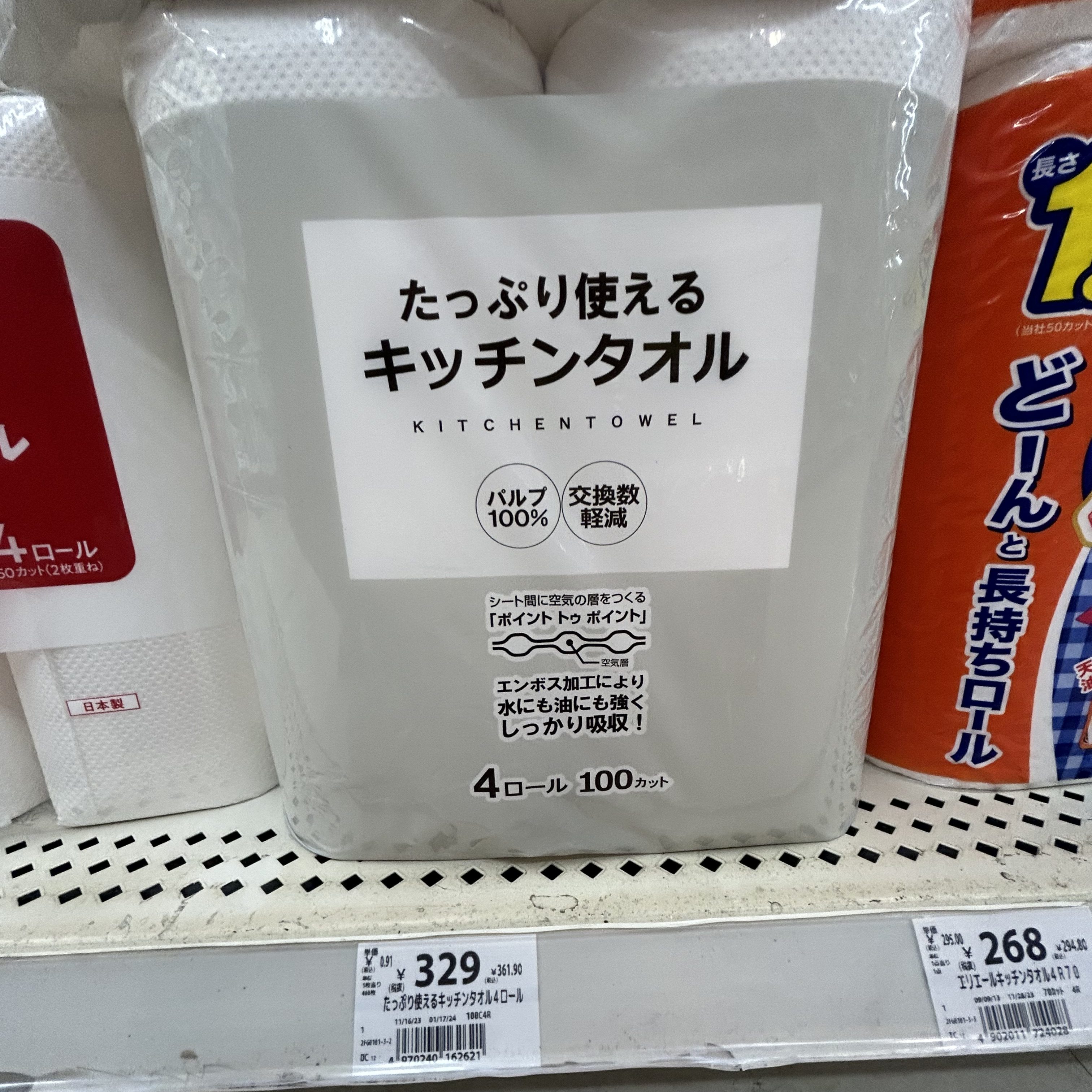 「きほんのきキッチンタオル」は「50カット×4ロール、189円」、「たっぷり使えるキッチンタオル」は「100カット×4ロール、329円」、エリエール超吸収(1.4倍巻と2倍巻)は、「70カット×4ロール、268円」と「100カット×6ロール、498円」がありました。
