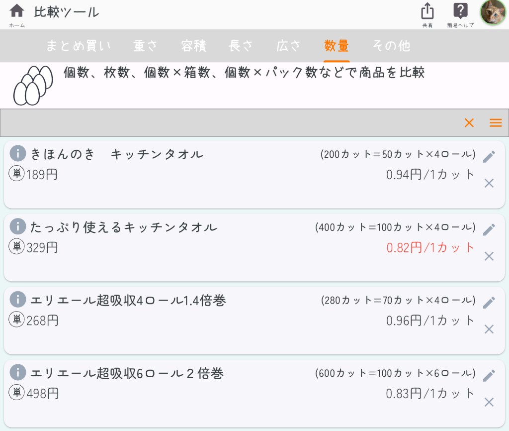 比較結果は、「たっぷり使えるキッチンタオル」でした。「エリエール超吸収6ロール2倍巻」も安いですね。1カット当たりの差は「0.01円」ですね。「たっぷり使えるキッチンタオル」のメーカーは何処でしょうか?