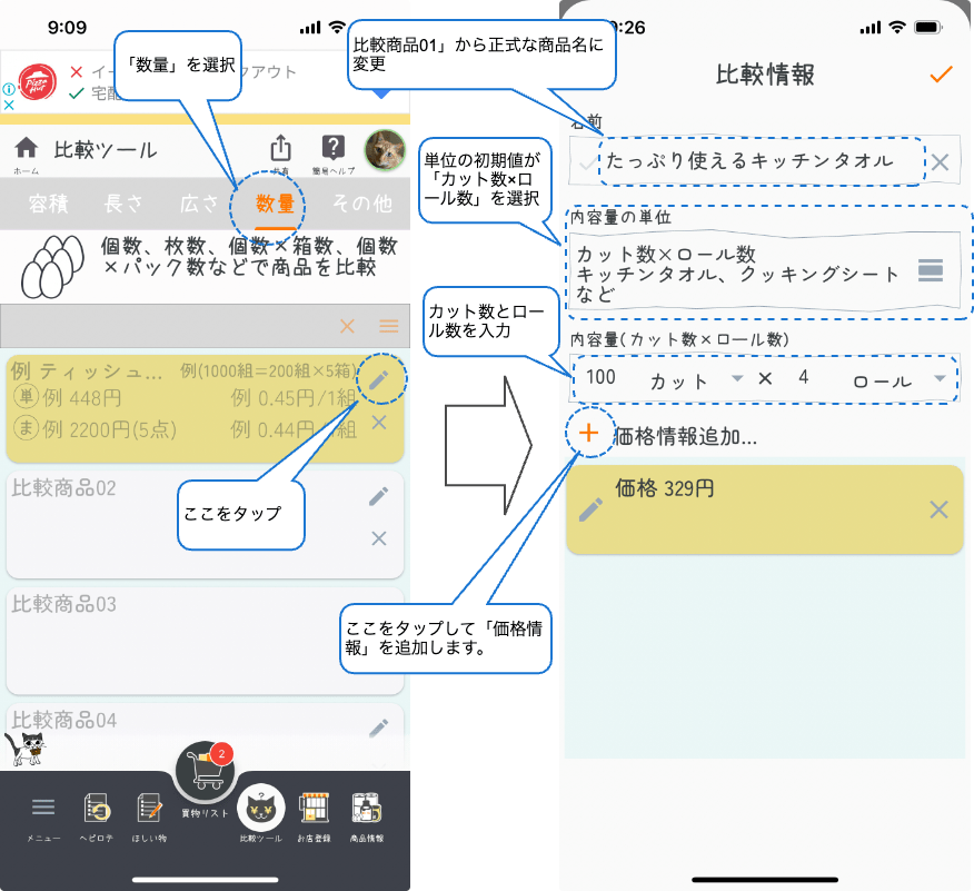 後は価格情報の入力ですが、最低限の情報として価格の入力が必要です。「売っている場所」や「有効期間」は入力しなくても比較は出来ます。