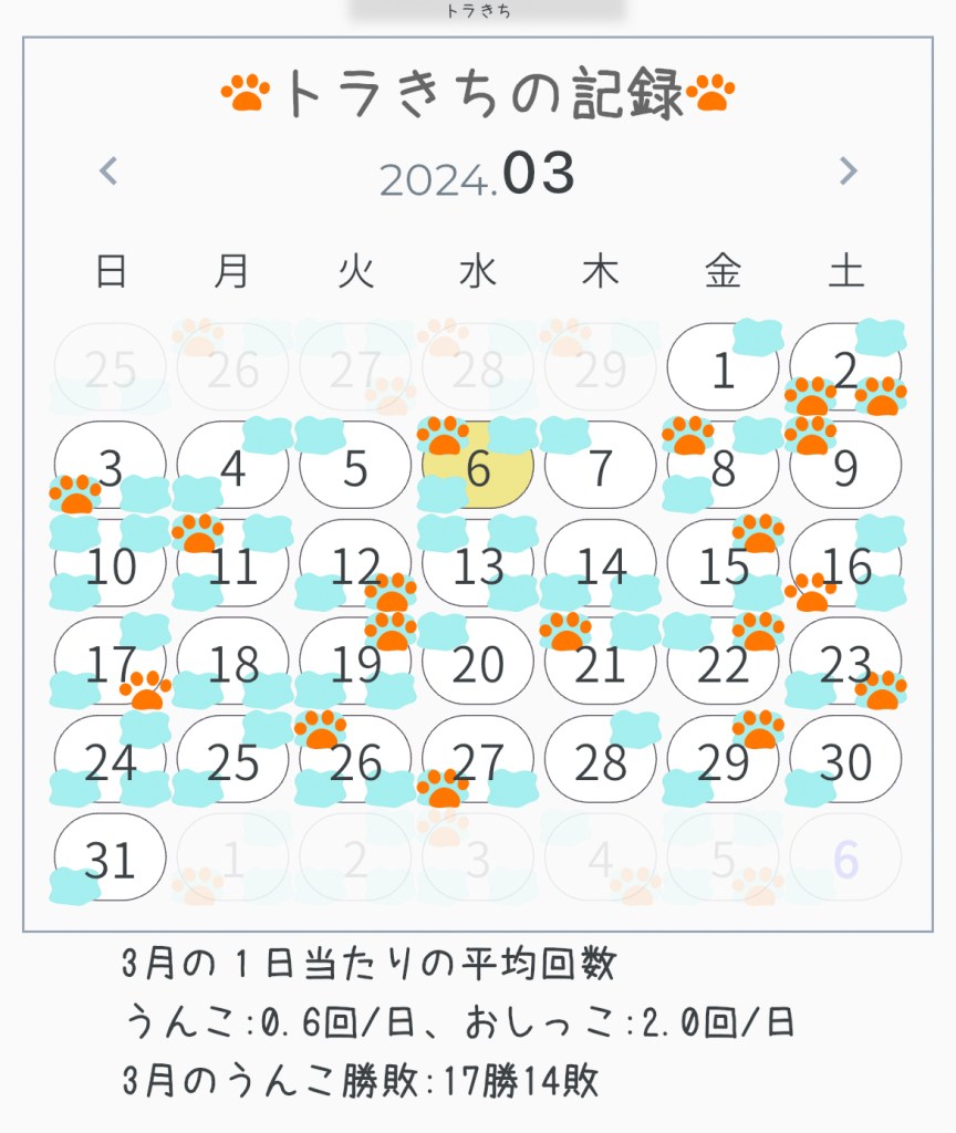 平均うんこ回数は、1月と2月は0.7回であったにも関わらず、3月は0.6回と減ってしまいました。うんこ記録が2日あいたりすることも多かったです。