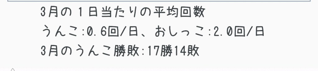 3月は、週のうんこ勝敗が3週目だけ5勝2敗で、他は4勝3敗となりました。