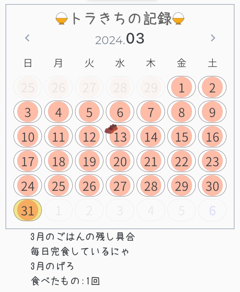 うんこが2日でなくても、ごはんは完食しています。食事がトラきちの健康のバロメーターで、ごはんを食べなくなったら即病院です。