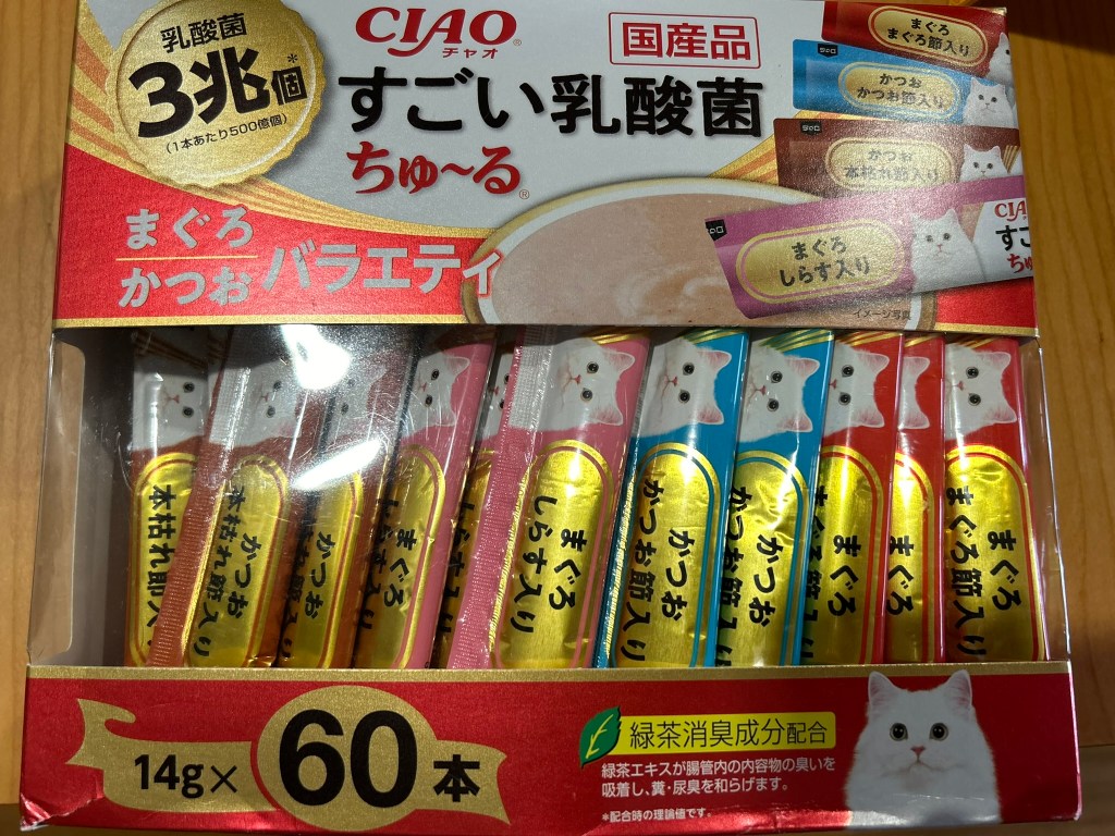 「ちゅーる」は最近買ったすごい乳酸菌のやつ。。