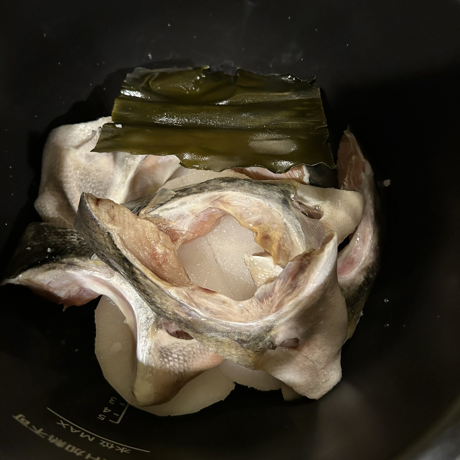 ホットクックの内鍋にだいこんを入れて、だいこんの上に鮭を乗せて、昆布も乗せて、調味料をかけます。大根も鮭も冷凍しているので、温まるのに少し時間がかかると思いました。この時は、昆布もぱりぱりです。