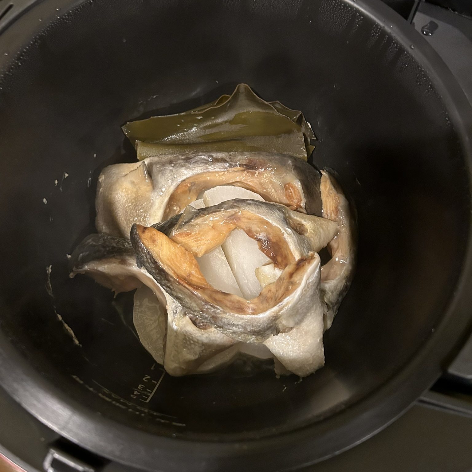 生協で買ったこの鮭かまは、ヘルシオオーブンで焼くことも考えたのですが、これもまた冷凍のだいこんがあったので、ホットクックで一緒に煮て、鮭だいこんを作ることにしました。