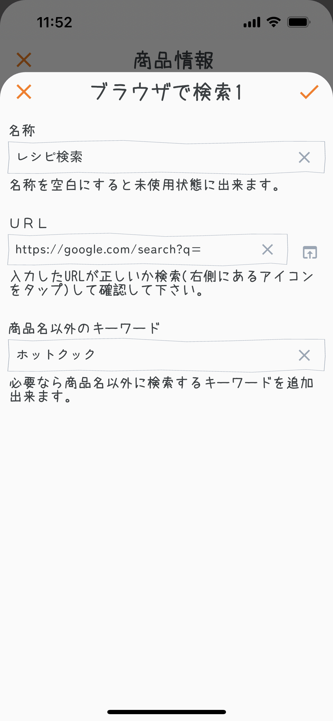 【お使いブギー】の商品登録ではWeb検索設定ができますが、キーワードも設定できるのでホットクックメニューが一発で探せます。