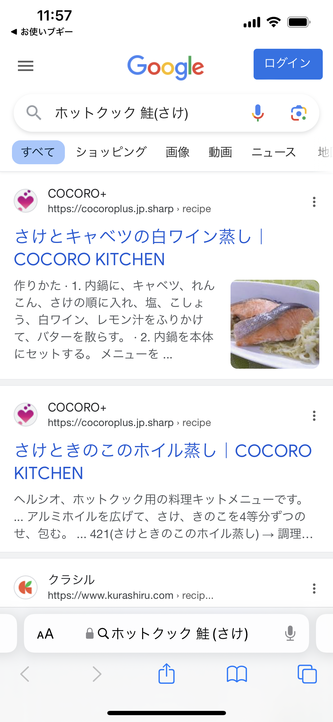 下の例は、商品情報「鮭」のレシピ検索に、キーワード「ホットクック」を入れておけば、右のようにホットクックの鮭レシピが表示されます。上位にこころキッチンが表示されているのがわかります。