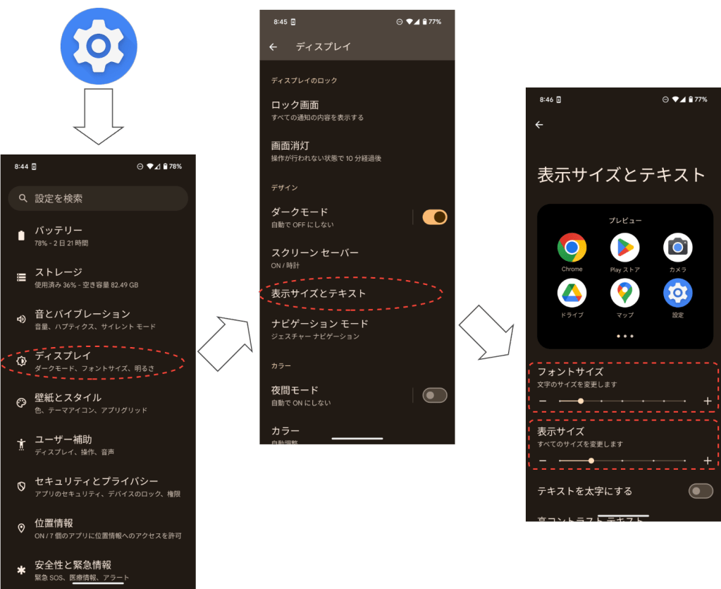 「設定」−>「ディスプレイ」−>「表示サイズとテキスト」で、フォントサイズと表示サイズをスライダで調整します。