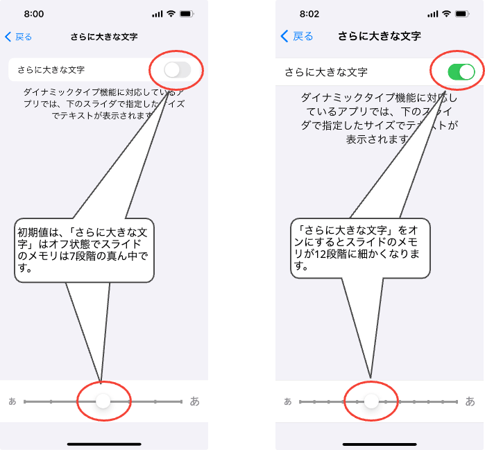 「さらに大きな文字」画面の下にあるスライダで文字のサイズを調整します。