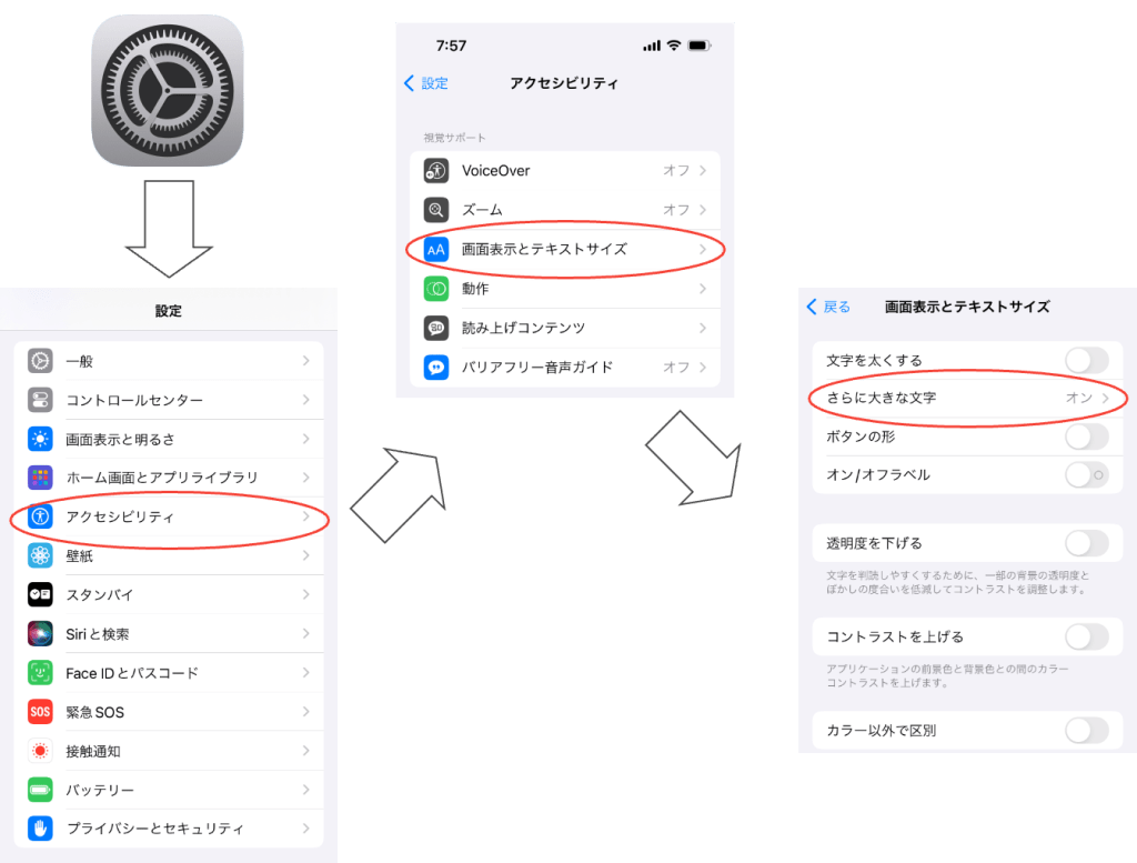 iPhoneの場合、「設定」−>「アクセシビリティ」−>「画面表示とテキストサイズ」−>「さらに大きな文字」でシステムの文字サイズを変更出来ます。