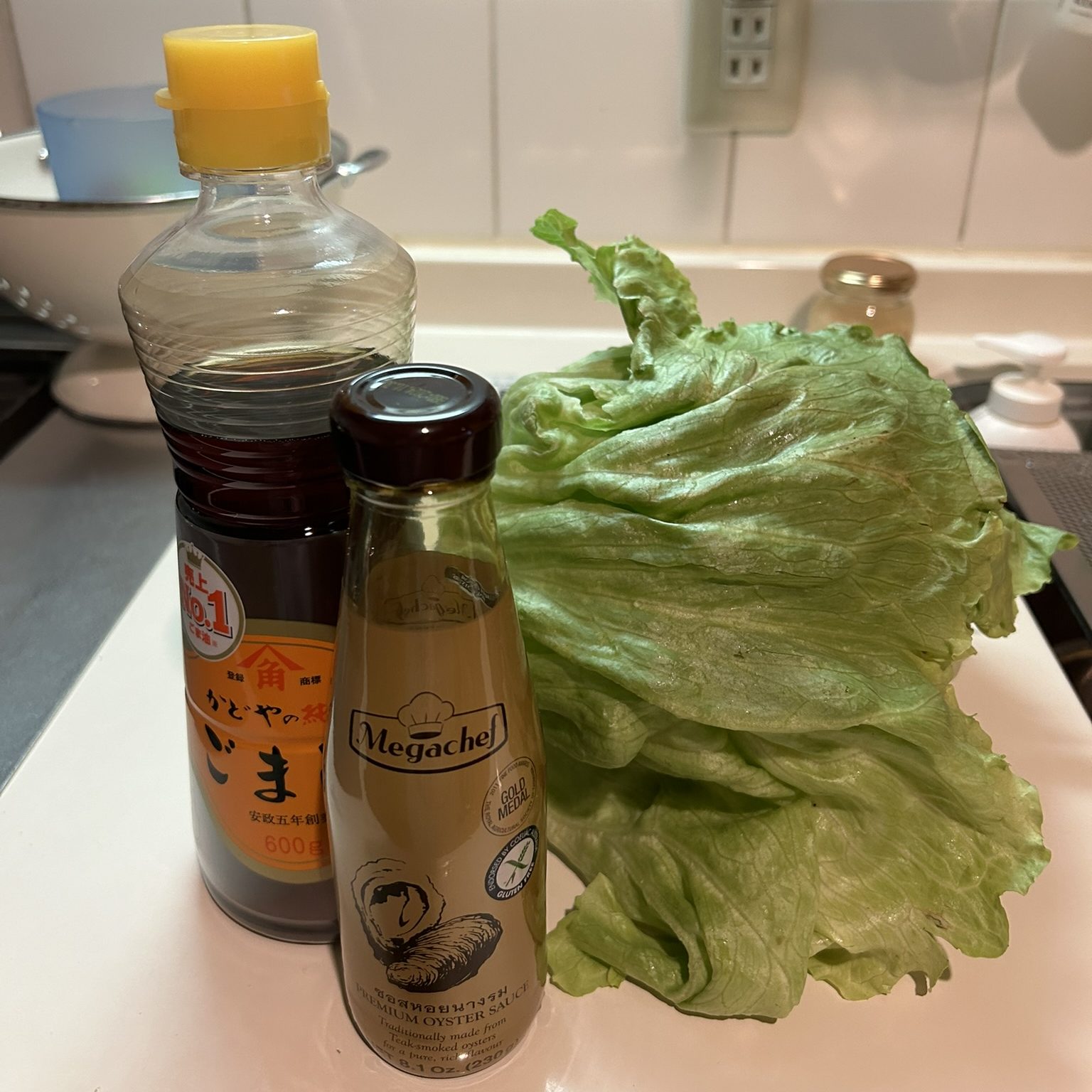 材料は、レタスとオイルと調味料だけです。今回は、オイルはごま油、調味料はオイスターソースを使いました。