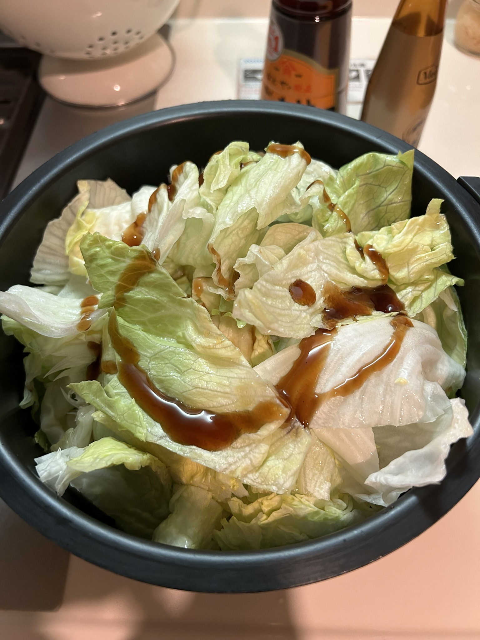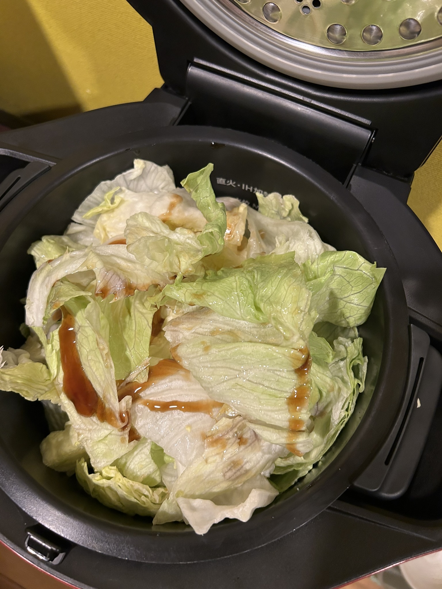 その上にごま油とオイスターソースをかけます。レタスの量が多くててんこ盛りになってしまいました。内蓋に調味料がべったりつきそうだったので、少し押し込んでから蓋を閉めました。