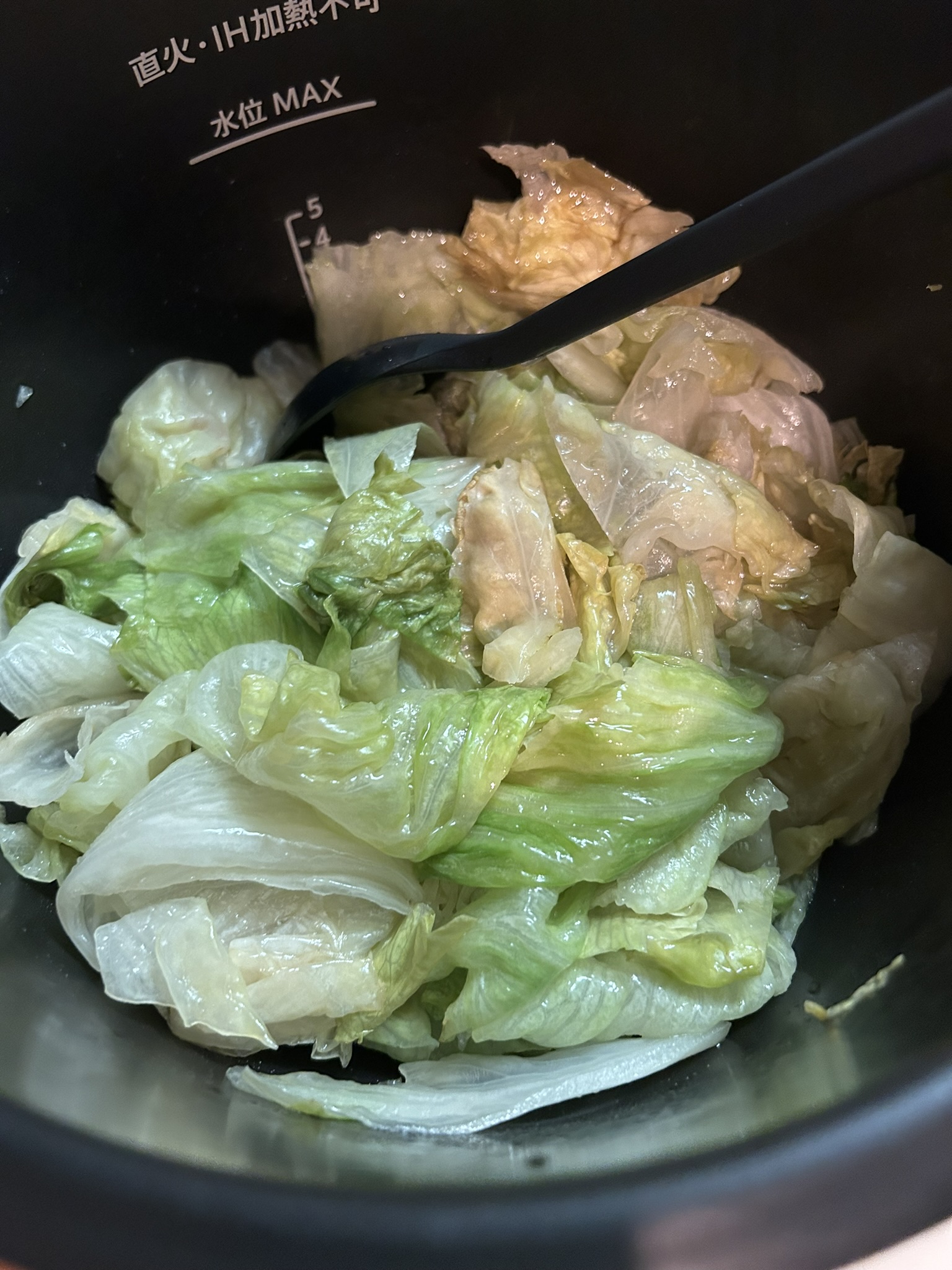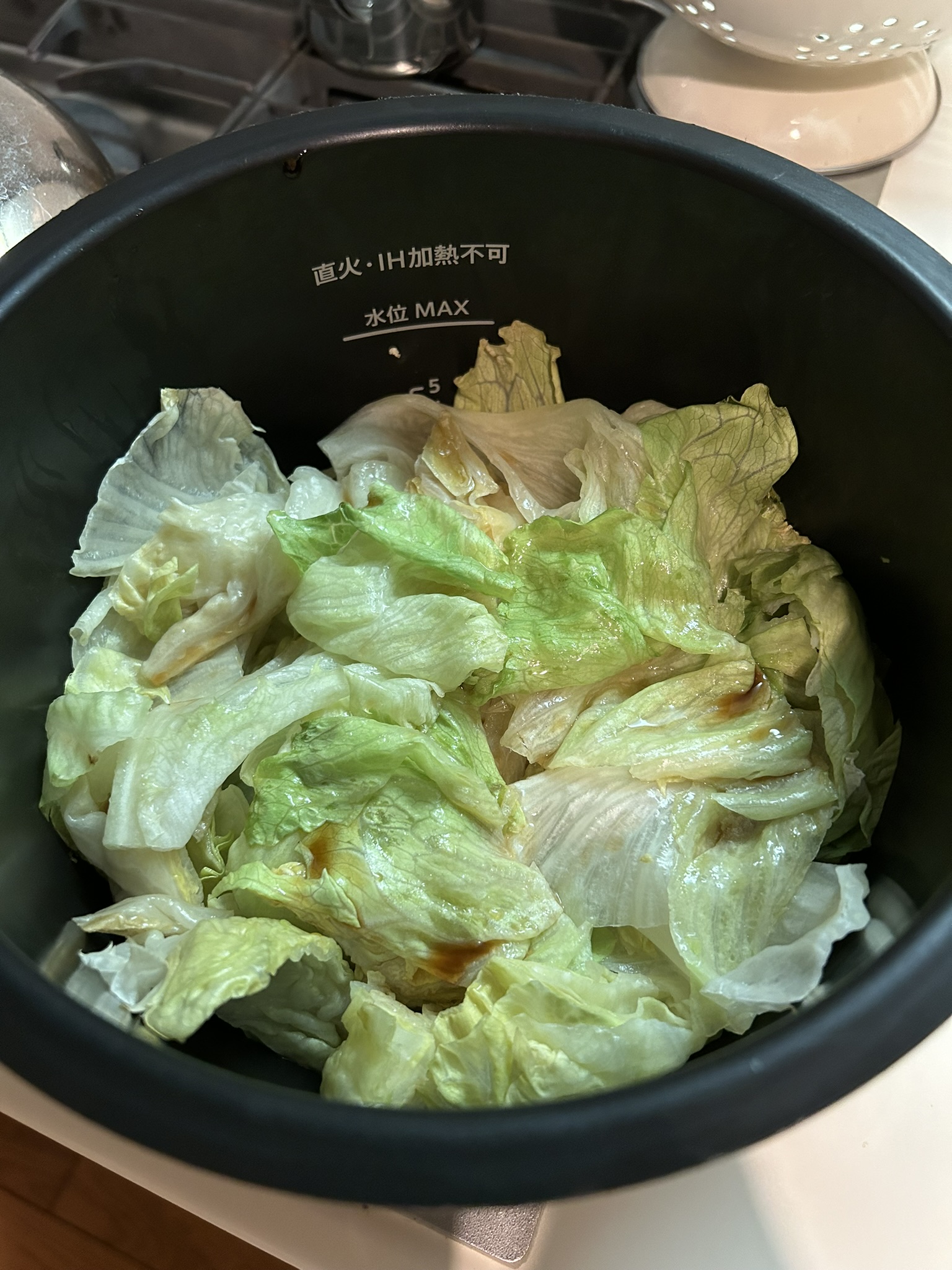 レタスはまるごと1個使用します。ちぎって内鍋に入れるのは時間がかかるので縦に8等分に分けて、そこからがちぎったり剥がしたりして内鍋に入れました。