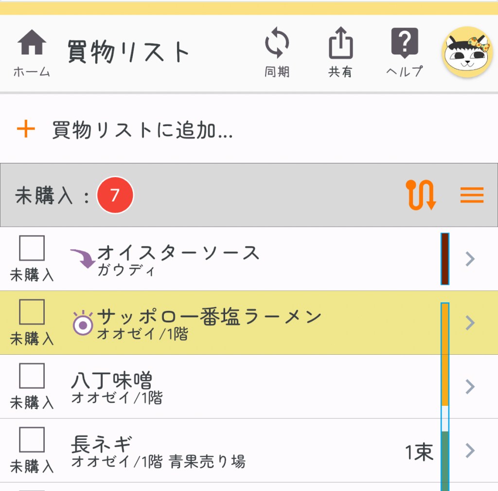 上の画面では、オイスターソースは「安かったら買う」、サッポロ一番塩ラーメンは「買えたら買う」になっています。前のバージョンよりもマークが目立つようになっていて、スーパーでも見落とさないようになりました。