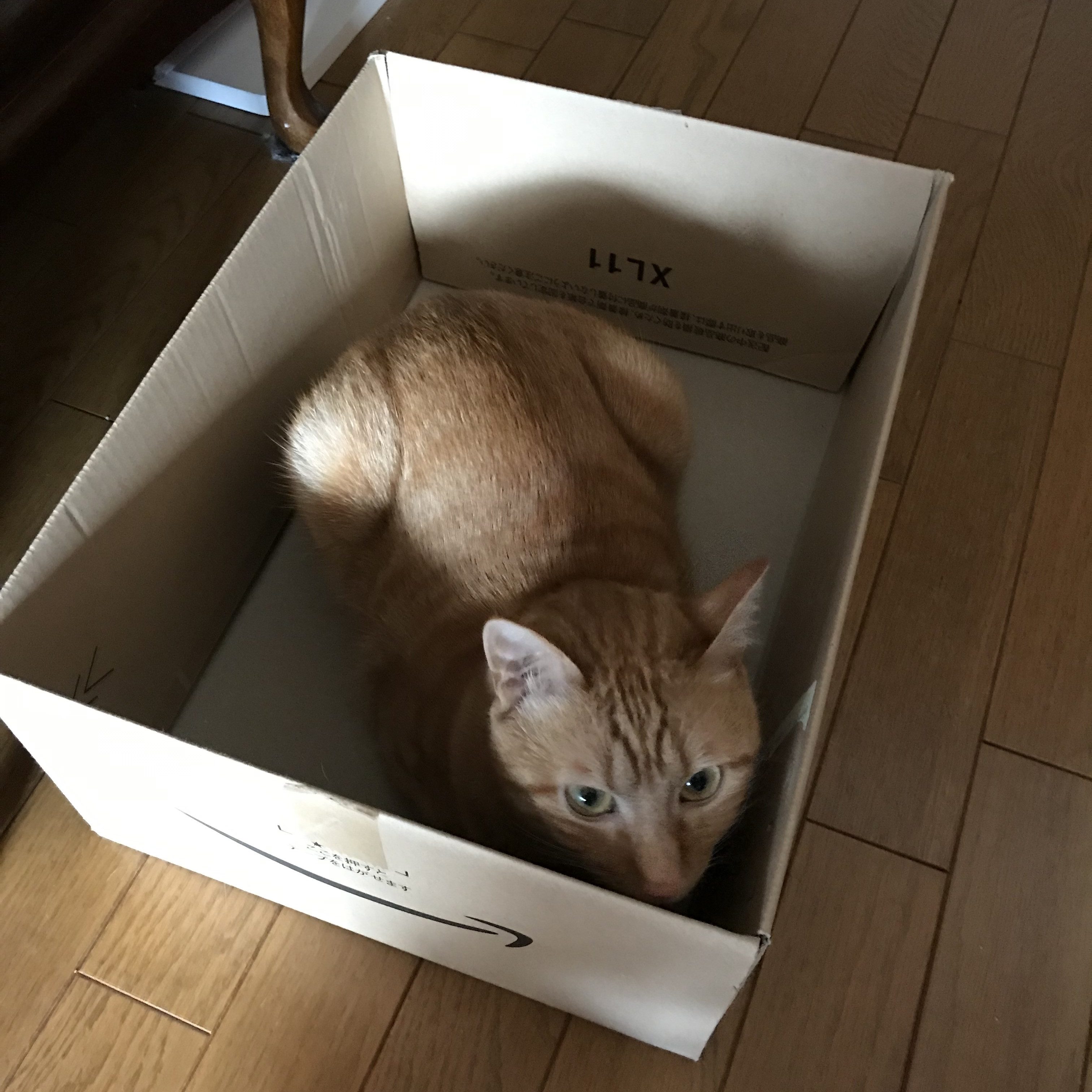猫ちゃんは箱に入るのが大好きです。ちょうどいい箱が空いたので、しばらく置いたままにしています。