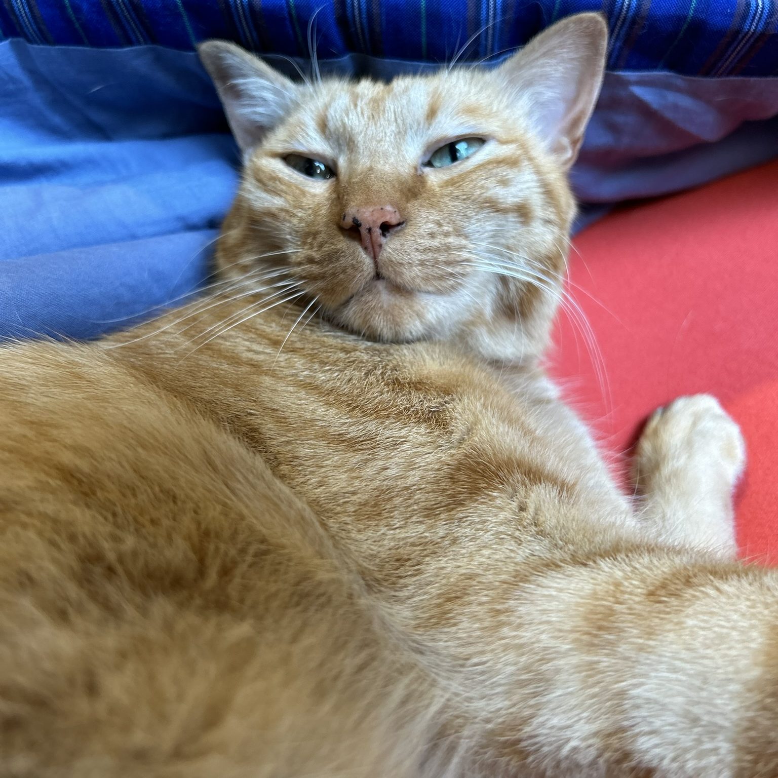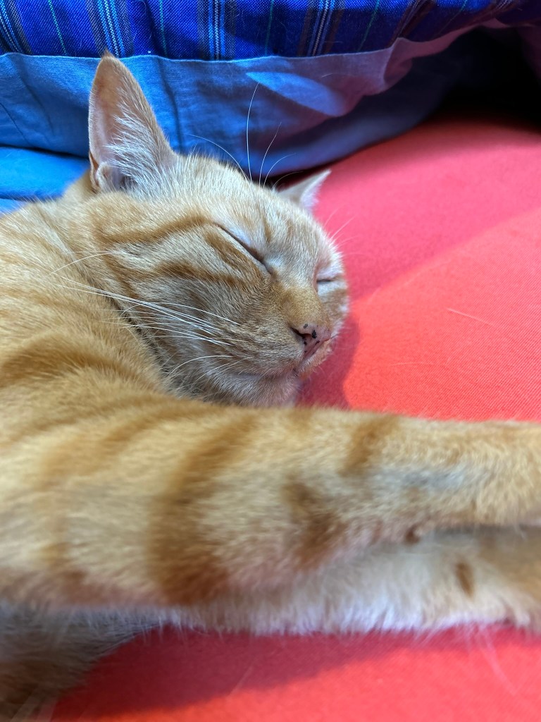 今日は、まったり、みんないるので安心してヨギボーの上のトラきちです。