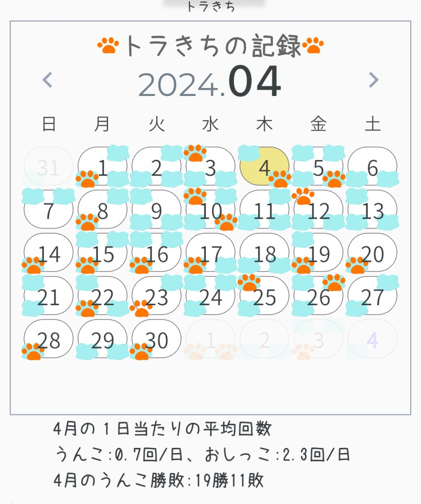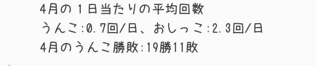 平均うんこ回数は、3月は0.6回でしたが、4月は0.7回に戻り改善が見られました。4月は2日あけることも少なくなりました。