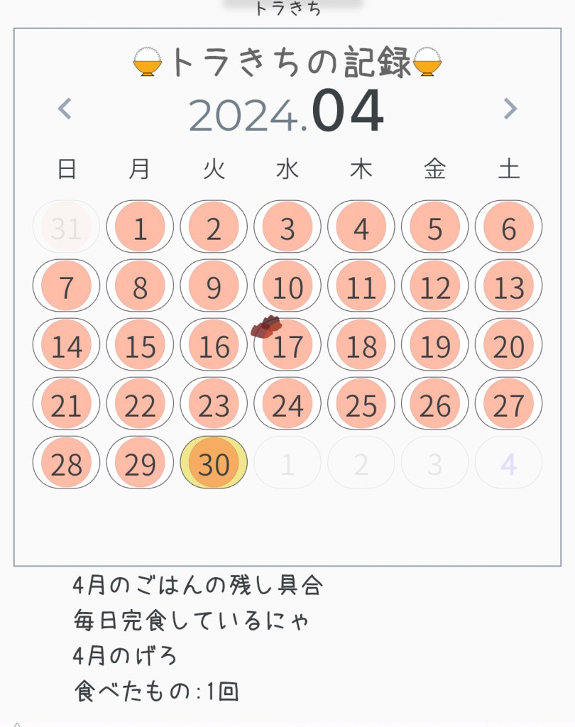お食事は、毎度のことながら完食です! ただし、一度だけごはんげろがありました。